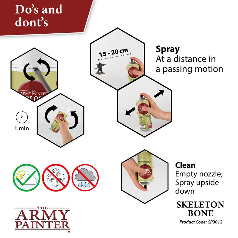 Introducing the AP Color Primer Skeleton Bone, perfect for painting armies of undead. With a precision nozzle and fast-drying formula, this spray primer in a perfect Bleached Bone color saves you time and leaves every detail in excellent condition. 24 colors available, with a 100% matching Warpaint. (Quicker than raising the dead!)
