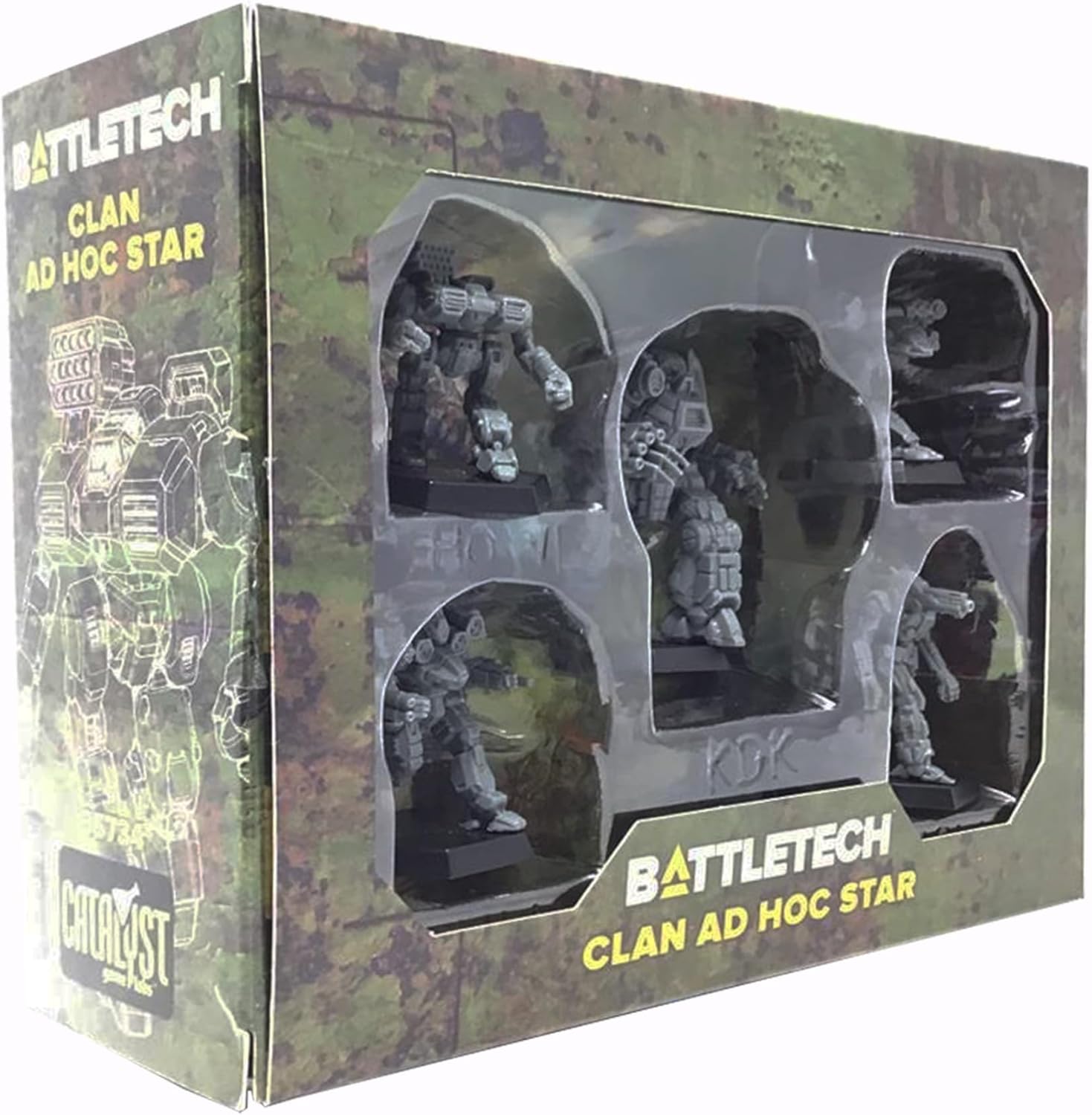 The Clan Ad Hoc Star is a collection of five plastic miniatures for use in the classic BattleTech tabletop and Alpha Strike games. The box also provides five dry-erase cards, which are intended to directly support Alpha Strike gameplay, and five new Clan Pilot Cards.