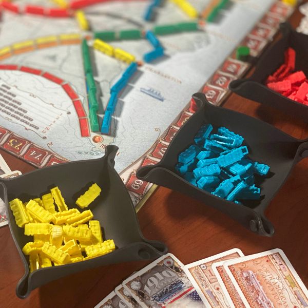 Spectrum Bit Trays are foldable bowls for organizing your board game pieces. When not in use, they can be stored flat. When in use, these fold together to form trays. Made from silicone, the tabs are very durable. These are sold in an attractive clamshell package that can stand on a shelf, or hung from a peg.