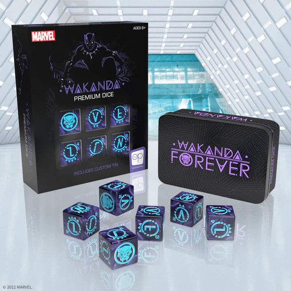 Take T’Challa’s noble spirit to your next game night with the Marvel Black Panther Premium Dice Set! This black and purple marbled, vibranium blue engraved 6-sided dice set features an icon of the masked defender with Wakandan numbers, all stored in an embossed tin carrying case decorated with a graphic of the superhero’s spiked collar.
