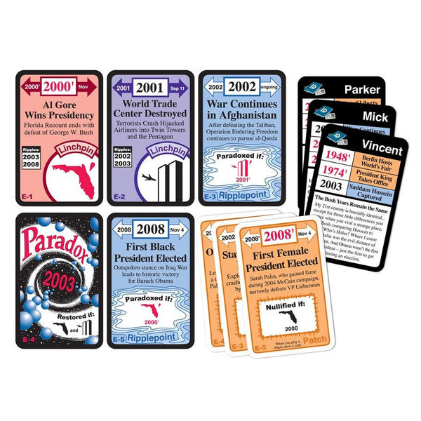 Chrononauts is now more than ten years old, and it's showing its age. A lot has happened in the 21st century, but the TimeLine stops at 1999! Introducing the Gore Years, an 11 card expansion for Chrononauts which extends the TimeLine from 2000 to 2008. The set includes 5 new TimeLine cards, 3 new Patches, and 3 new Characters who depend on this new strip of TimeLine.