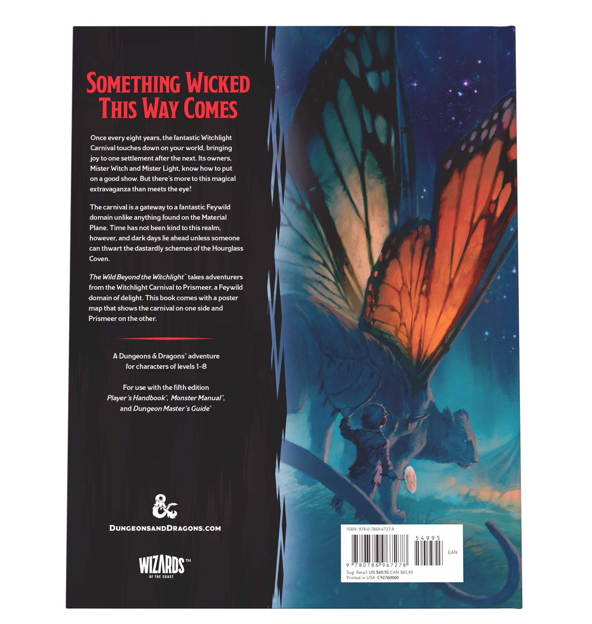The Wild Beyond the Witchlight takes adventurers from the Witchlight Carnival to Prismeer, a Feywild domain of delight, and is designed for characters of levels 1–8. This book comes with a poster map that shows the carnival on one side and Prismeer on the other.