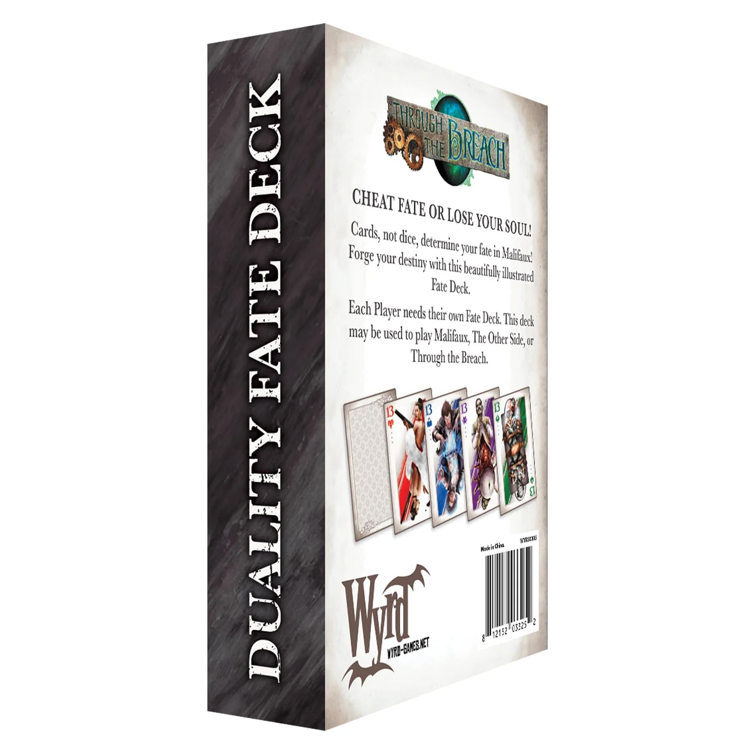 Malifaux and Through the Breach use cards, not dice, and this beautifully illustrated card pack is a FATE DECK. Each Deck is 100% plastic with the Malifaux suits. Two Fate Decks are needed to play the game, one for each player.