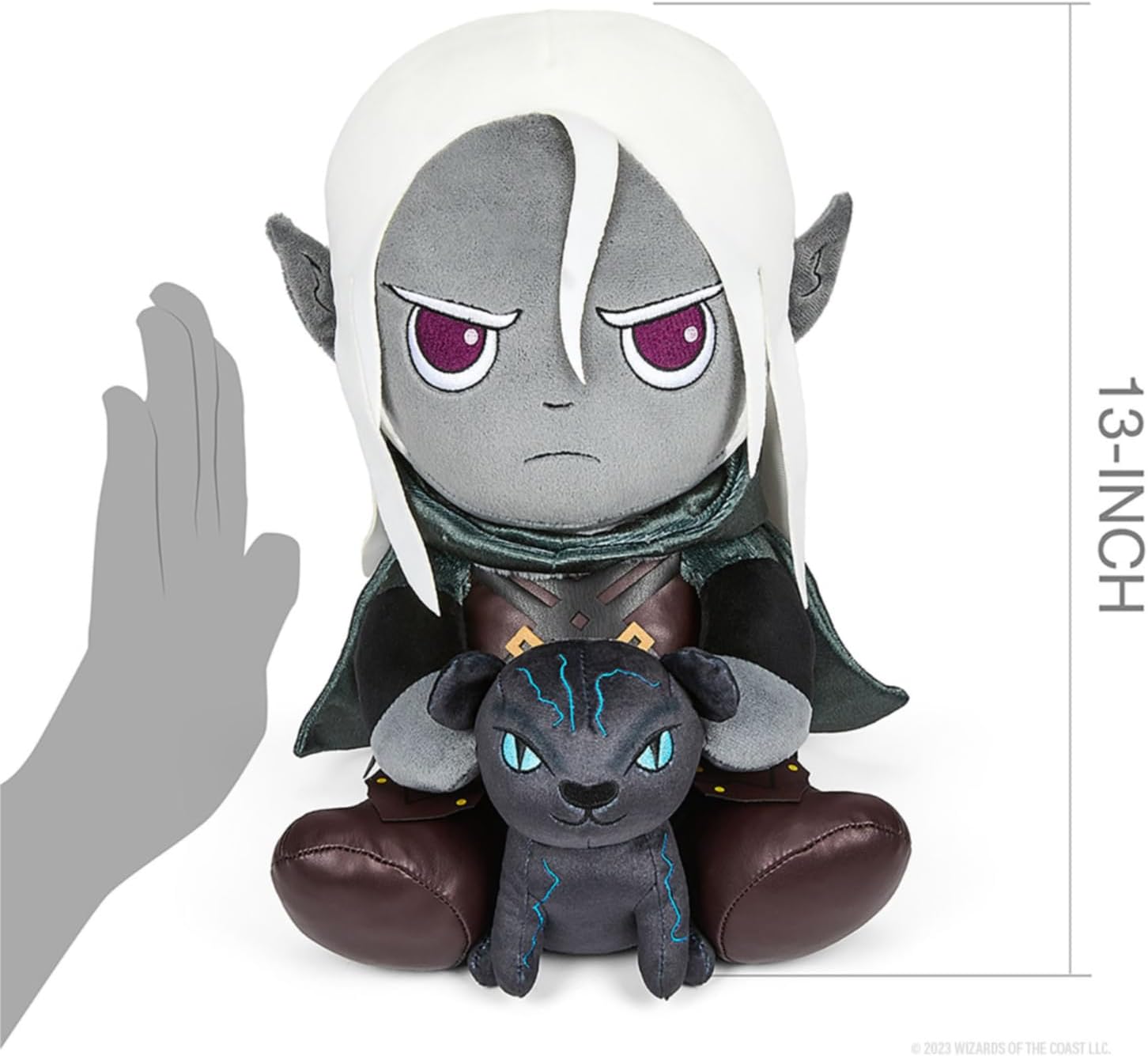 You’ve seen a number of iconic D&D creatures rendered in cuddly plush, but now you can own a cuddly companion of one of the Forgotten Realms’ most iconic heroes! Drizzt, the drow ranger, is a formidable force for good in northern Faerûn; his plush form even wears his iconic fur-brimmed green cloak that he rarely leaves home without! Drizzt is also accompanied by his own plush pet in the form of his beast companion Guenhwyvar, the black panther who is summoned by his Figurine of Wonderous Power. With this plush at your side, you will be sure to go on some fantastic adventures and you will be in great company while you do so! This plush is one of many offerings to celebrate the 35th Anniversary of Drizzt—it sits at 13 inches tall and is made with the softest premium materials and love.