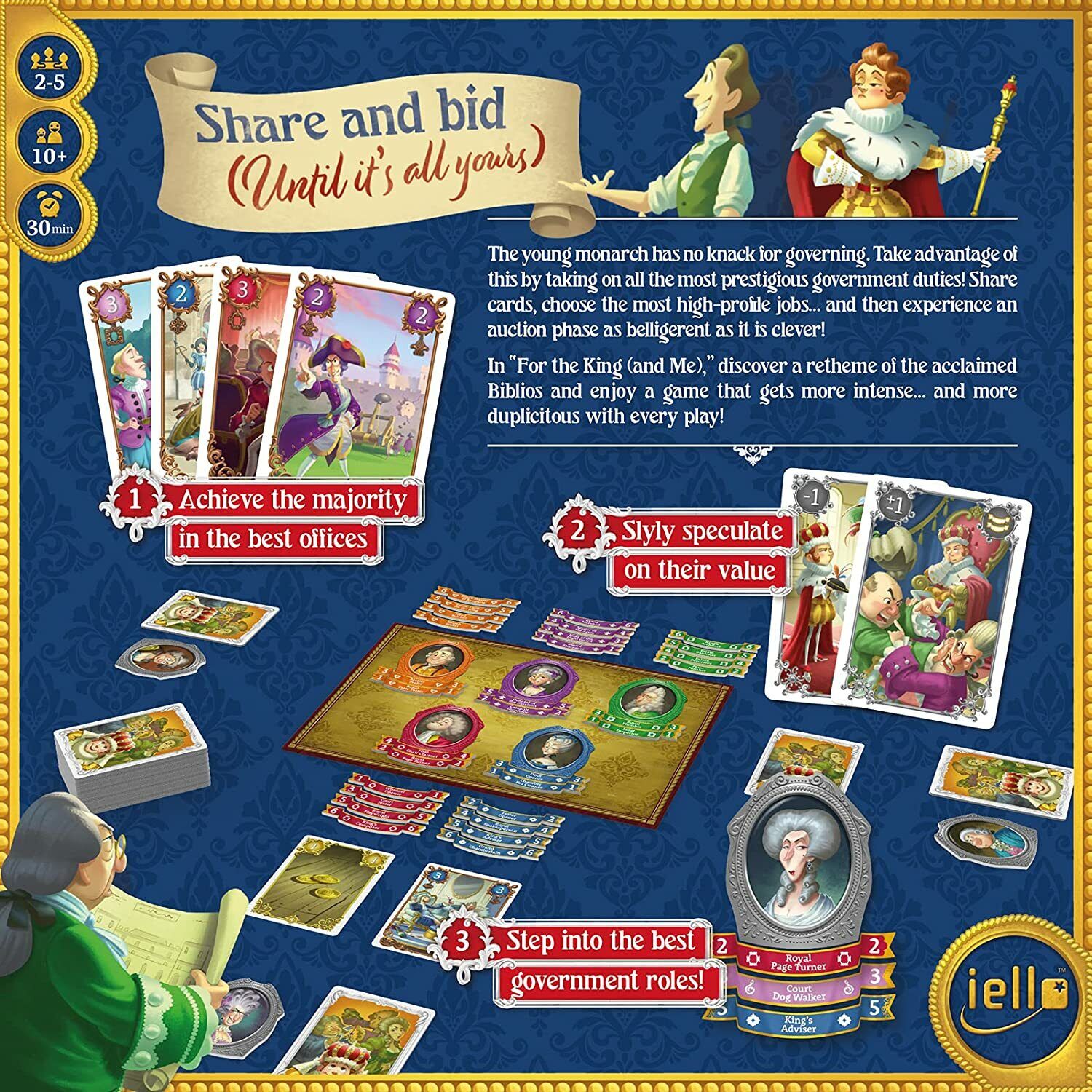 In For the King (and Me), you wish to become the most valuable minister by collecting the right cards while lowering the value of your opponents' objectives. The game plays the same as the designer's earlier game Biblios, while allowing for play with up to five people at once.