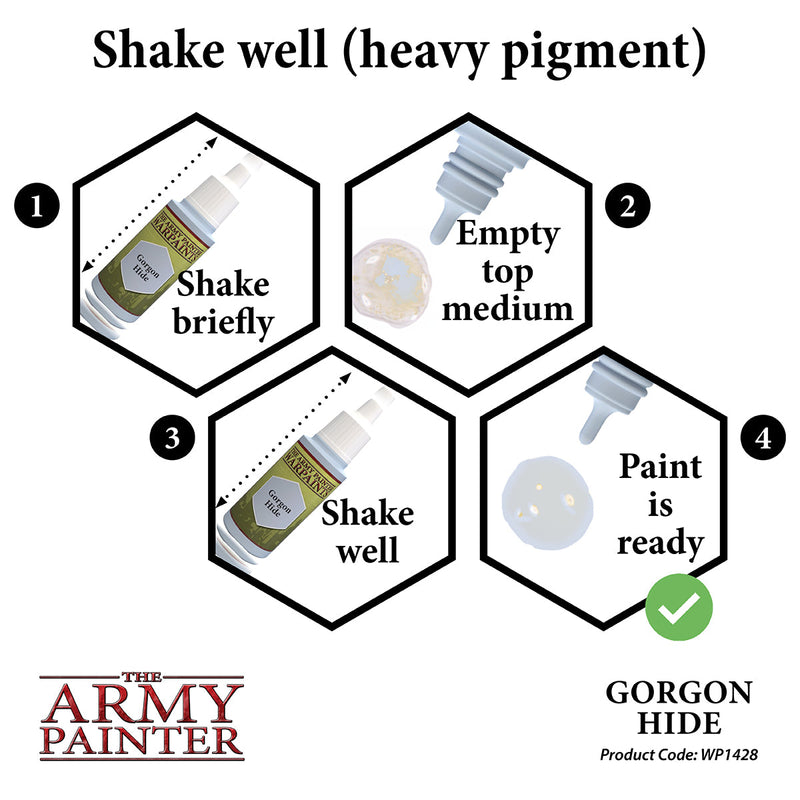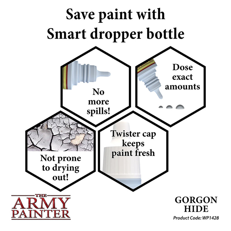Transform your miniatures into works of art with AP Warpaints Gorgon Hide. This high pigment color range is perfect for any period, size, or system. With the Army Painter System, you can paint your army quickly and spend more time on the battlefield. (Get ready to conquer with a little help from our gorgon hide!)