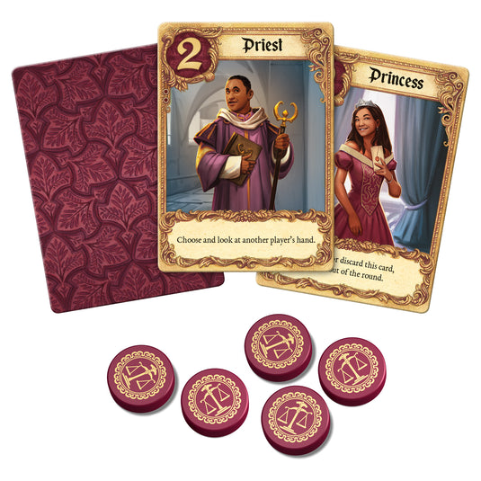 Love Letter is a game of risk, deduction, and luck for 2–4 players. Your goal is to get your love letter into Princess Annette's hands while deflecting the letters from competing suitors. From a deck with only sixteen cards, each player starts with only one card in hand; one card is removed from play. On a turn, you draw one card, and play one card, trying to expose others and knock them from the game. Powerful cards lead to early gains, but make you a target. Rely on weaker cards for too long, however, and your letter may be tossed in the fire!