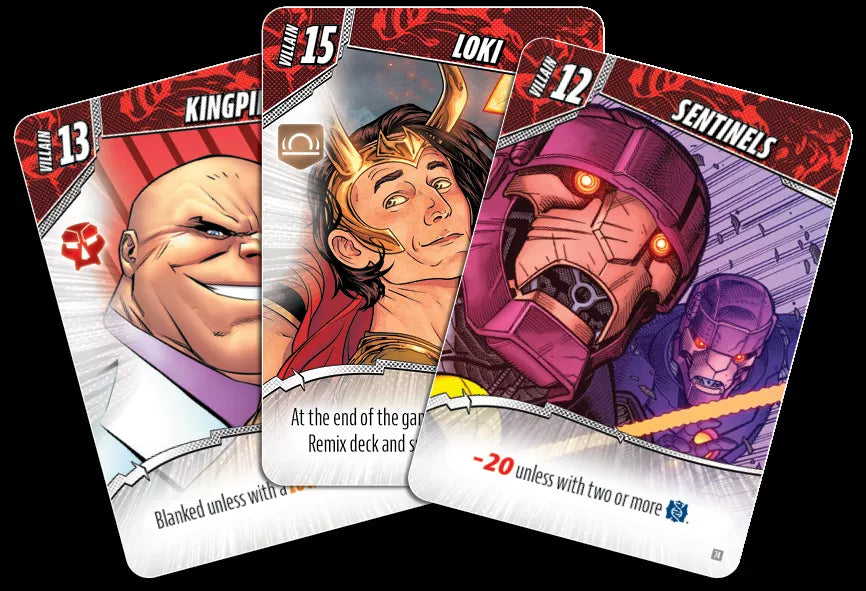 In Marvel: Remix, players build a team of heroes and allies to take on infamous villains. They are dealt a hand of seven cards that will contain characters, items, or locations from throughout the Marvel Universe. Then, players go about can arming their characters with powerful equipment or maneuvers and use their cards to pull off epic combos. The player that has the most points at the end of the game wins.
