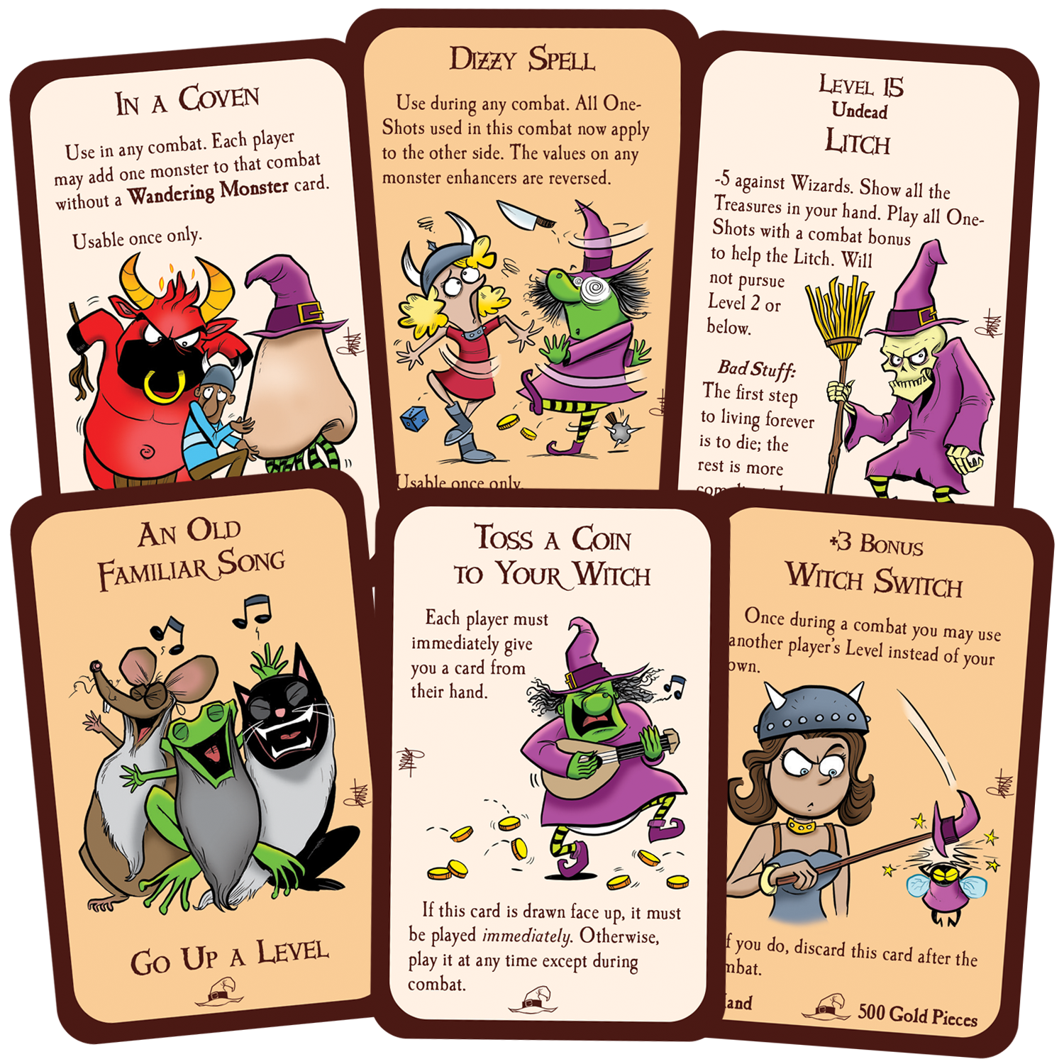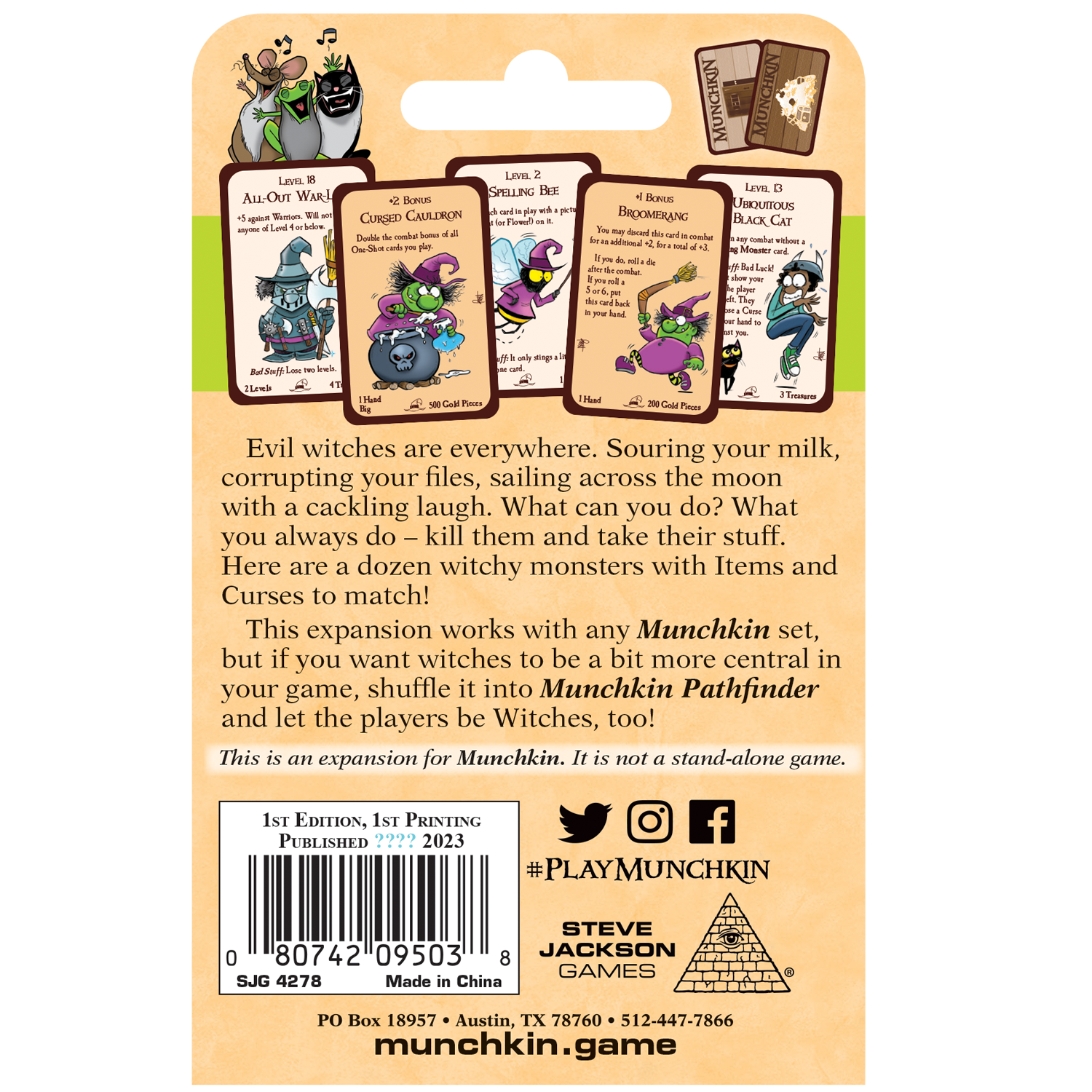 This expansion works with any Munchkin set, but if you want witches to be a bit more central in your game, shuffle it into Munchkin Pathfinder and let the players be Witches, too!