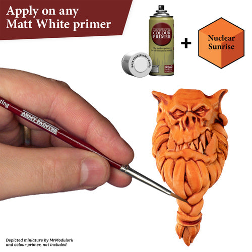 Before using Speedpaints, we recommend priming your miniatures with Colour Primer Matt White, Colour Primer Brainmatter Beige or Colour Primer Ash Grey to achieve your most vibrant results. However, you can also experiment with other Colour Primes like Necrotic Flesh, Skeleton Bone, or Gun Metal etc. to achieve other cool effects.