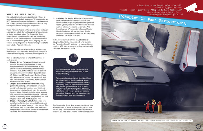 Of course, the main Paranoia rulebook is perfect. Maybe even the perfectest. But you know what would make that even more perfecter? A companion book! But since this is Paranoia, it is called the Paranoia Accomplice Book. This is the Accomplice Book. Inside, you will find a bunch of rules and content for your next Paranoia mission so your players are confused, a bit worried, and having a blast. Have you got older editions of paranoia? Here you will find instructions for using old rules with the new edition. If you like commendation points, registered mutants, and older secret societies, they are back! That old mission you kept all these years can still be run!