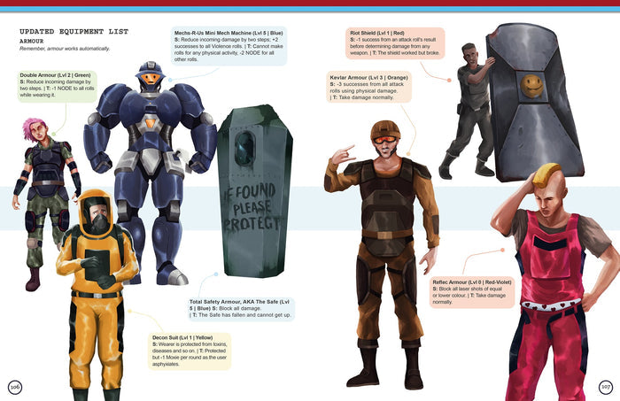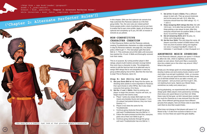 Want to create your own missions but are unsure what to do exactly. Welcome the return of the Mission Blender: a system that picks out villains, allies, and situations typical of Paranoia. Want to drop alpha complex celebrities into your missions? Now you have stats for Teela-O-MLY, Captain Alpha, Funbot, and an entire cast more of characters. Want a more custom experience? You get a number of optional rules to customise the game: non-competitive character creation (ha!), spending Moxie anonymously, and for those who love their combat a bit crunchy, hit points and stat-based initiative. How about some brand-new stuff? More Alpha Complex celebrities, Top 5 lists, gear, prescription meds1, advancing in your secret society, linking promotions to XP Points, and slang Troubleshooters use to communicate without getting arrested by IntSec. There is even a Paranoia glossary defining terms like Code 7, funball, public hating squares, and why we call ourselves Famous Game Designers. (Protip: We are sarcastic.)