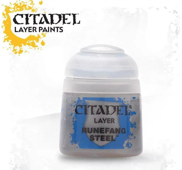 Runefang Steel is a Citadel Layer paint. Citadel Layer paints are high quality acrylic paints and with 70 of them in the Citadel Paint range you have a huge range of colours and tones to choose from when you paint your miniatures. They are designed to be used straight over Citadel Base paints (and each other) without any mixing. By using several layers you can create a rich natural finish on your models that looks fantastic on the battlefield. This pot contains 12ml of Runefang Steel one of 70 Layer paints in the Citadel Paint range. As with all of our paints it is a non-toxic water-based acrylic paint designed for use on plastic metal and resin Citadel miniatures.