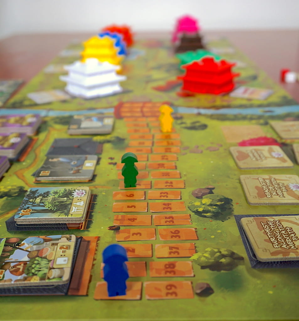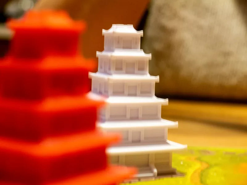 The key feature of the game is drawing the pagoda tiles from the bag. The pagoda tiles have a decreasing size per level. Players are welcome to blindly rummage around to try to recognize the floor by its size, but they aren’t likely to be able to detect the color this way, so drawing the floor size they want depends on their tactile recognition, but they have to weigh their odds to draw the color they want.