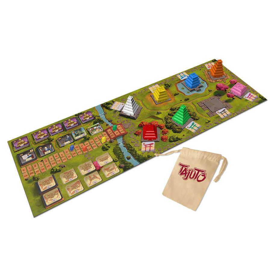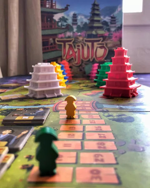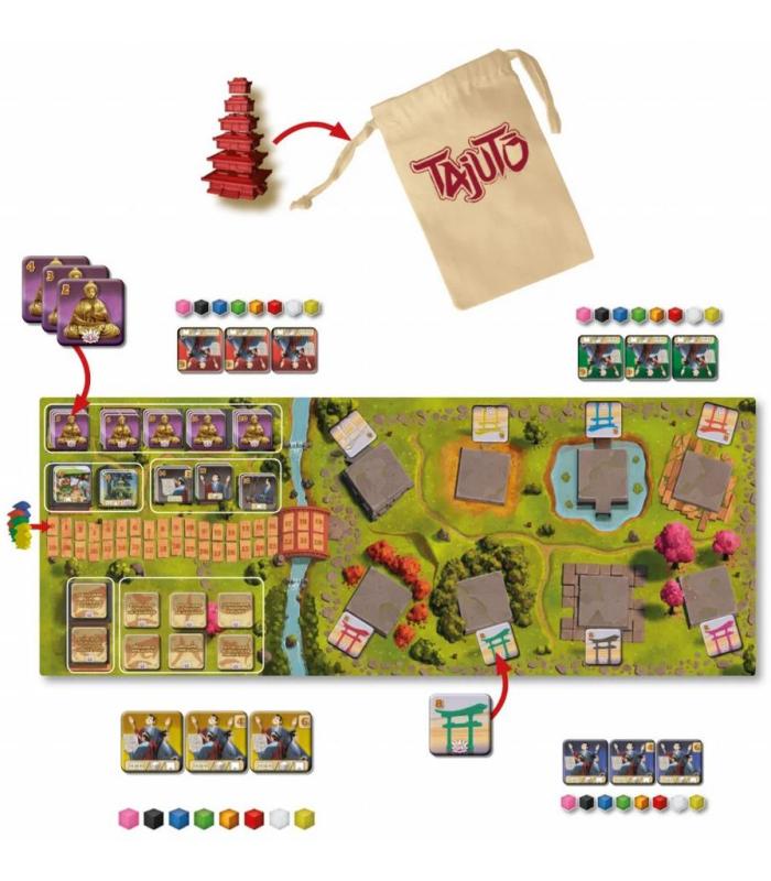In Tajuto, players take on the roles of the Buddhist monks, trying to achieve the highest spirituality. On their turn, they can activate their action tiles to draw (and build) pagoda tiles from the bag, make offerings to gain meditation points, and acquire tiles that will help them progress more quickly or earn them spirituality points. Activating more than one action tile or acquiring tiles costs meditation points. The game ends once the fourth pagoda is finished. The player with the most spirituality points wins.